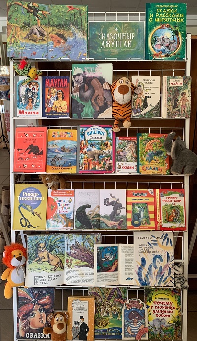 Редьярд Киплинг написал немало произведений о животных, на книжно-иллюстративной выставке «Сказочные джунгли Редьярда Киплинга» представлены следующие из них: «Маугли», «Рикки-Тикки-Тави», «Почему у слоненка длинный хобот», «Откуда взялись броненосцы», «Сказки и рассказы о животных», «Отважные мореплаватели», «Кошка, которая гуляла сама по себе» и другие.