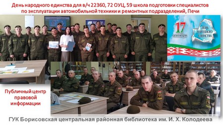 Историко-правовой час «17 сентября – День народного единства» в публичном центре правовой информации Борисовской центральной библиотеки посетили военнослужащие 59 школы подготовки специалистов по эксплуатации автомобильной техники и ремонтных подразделений, 72 ОУЦ, в/ч 22360, Печи.