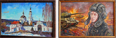 Теперь в фондах библиотеки будут храниться, а при необходимости экспонироваться новополученные художественные произведения. Это – «Черноостровский монастырь г. Малоярославец» (2023 г.) члена Союза художников России и Международного союза художников Владимира Пугачёва, а также написанная специально ногинским художником Алексеем Саблиным «К 81-ой годовщине освобождения города-побратима Борисова от немецко-фашистских захватчиков». Вторая картина подписана как «С.А. 2025». Автор преподает в Муниципальном учреждении дополнительного образования "Ногинская детская художественная школа". Художник изобразил момент освобождения Борисова 1 июля 1944 года, использовав прообраз трёх отважных танкистов экипажа Павла Рака.
