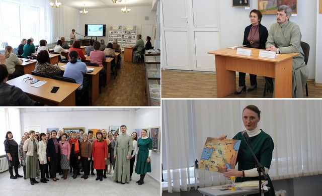 Далее искусствовед отдела галерейно-выставочной деятельности Анжела Кудакова провела интересный экскурс в «Мир и свет православной культуры», познакомив участников мероприятия с художественной выставкой работ из коллекции центральной библиотеки. Анжела Антоновна рассказала о картинах Анны Соломенник, Ирины Гинц, Натальи Антоновой, Татьяны Каландырец, Петра Козявина и других художников.