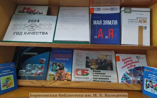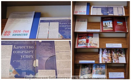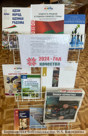 «2024 – Год качества». Центр правовой информации Борисовской центральной библиотеки приглашает познакомиться с правовыми документами и другими материалами информационно-книжной выставки, посвященной Году качества. Девиз 2024 года: «Качество во всем — залог процветания Беларуси». Качество — это бренд нашей страны. «Сделано в Беларуси» — марка, которая признана на рынках многих стран. В рамках Года качества акцент будет сделан на повышении конкурентоспособности Беларуси через бережное и продуманное отношение к ресурсам, реализацию высокотехнологичных и энергоемких проектов, приоритет качественных показателей над количественными. В течение года выставка будет дополняться новыми материалами.