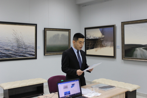 Конечно же, свой взгляд на живопись Валерия Шкарубы представил и соискатель учёной степени кандидата наук Белорусского государственного университета культуры и искусств Сюй Цзинань. Очень тонко и трепетно он подошёл к изучению творчества Валерия Фёдоровича. Сравнив его произведения с китайской живописью, молодой человек увидел в художественных трудах удивительное сходство с видом китайской живописи шань-шуй, которую изучал раньше.