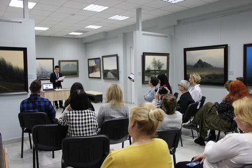 – Очень приятно, что к нам присоединяется большое количество людей, которые неравнодушны к творчеству, высокому искусству, в том числе, к творчеству уроженца Борисова Валерия Шкарубо. Валерий Фёдорович хоть и жил в Минске, но всегда приезжал в нашу библиотеку, в галерею – своё родное любимое дитя, – в которую он вложил очень много сил и души, – отметила Елена Сергеевна. – Мы гордимся тем, что галерея продолжает жить и после ухода художника из жизни, Мы занимаемся мемориальной деятельностью и открываем для себя новые имена – такие, как, например, имя Сюй Цзинаня. Получив приглашение на XIII международную научно-практическую конференцию «Культура Беларуси. Реалии современности», в программе работы секции по декоративно-прикладному искусству мы увидели выступление Сюй Цзинаня. Побывать на нём не удалось, однако посчастливилось пригласить гостя в библиотеку.