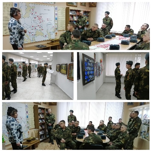 Сотрудники библиотеки рассказали срочникам о славном боевом прошлом российских городов-побратимов: Москвы, Малоярославца, Ельца, Подольска и Гагарина. Ребята узнали много интересных фактов из истории этих населённых пунктов, связанных с событиями войны 1812 года и Великой Отечественной. Завершилась встреча небольшой экскурсией в галерее «З’ява» по выставке «Борисовский колорит», где они посмотрели картины ведущих художников Борисовского края.