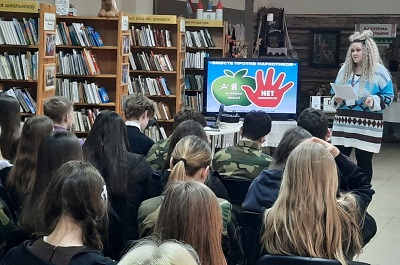 В ходе мероприятия ребята поучаствовали в игре «Сюрприз», целью которой являлось выяснение и обсуждение мотивов начала употребления наркотических средств. Учащиеся приняли активное участие в беседе, высказывали негативное отношение к наркотической зависимости. Библиотекарь Юлия Харламова познакомила учеников с выставкой, на которой были представлены буклеты, научная и медицинская литература. Особенно ребятам понравилась книга Марии Седерберг «Наркотик-убийца», которую представила библиотекарь, написанная о жизни людей, пострадавших от наркотиков.