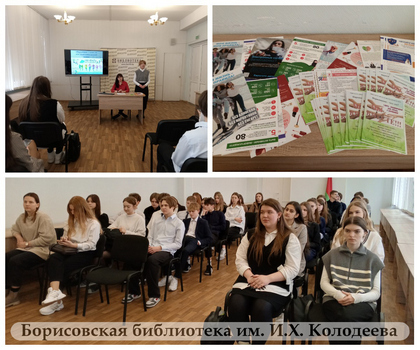18 марта 2024 г. сотрудники ГУ «Борисовский зональный центр гигиены и эпидемиологии» Поташёва Юлия Сергеевна, заведующий отделом общественного здоровья и социально-гигиенического мониторинга, и инструктор-валеолог Зязюля Елена Павловна провели в центральной библиотеке профилактическую беседу с учащимися 10-х классов ГУО «Средняя школа № 8 г. Борисова» и 11-го класса ГУО «Гимназия №3 г. Борисова» на тему «Наркотики: мираж и реальность» .